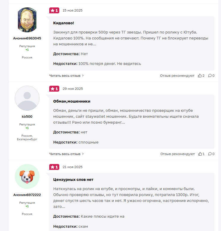 - В негативных отзывах о StayWallet ru владельцев называют мошенниками, сообщают о потере средств, что формирует однозначную репутацию, которая говорит о высоких финансовых рисках при взаимодействии с проектом.
