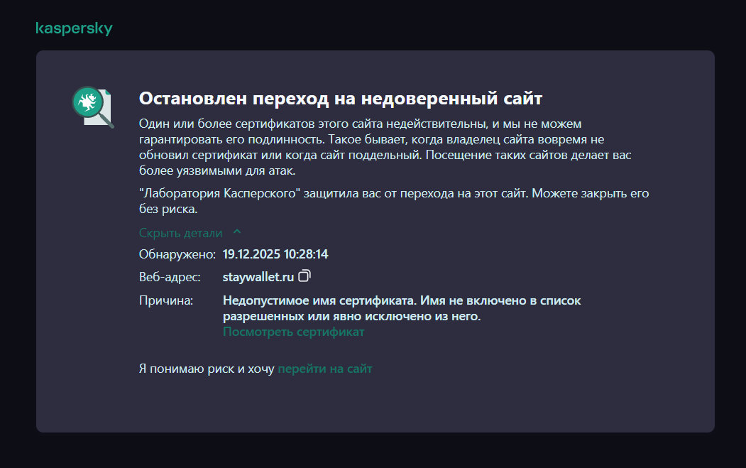 В середине декабря 2025 года при входе на официальный сайт проекта StayWallet ru антивирус показывает предупреждение об опасности из-за недействительных сертификатов.