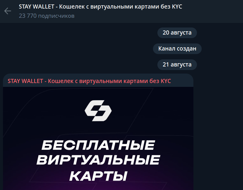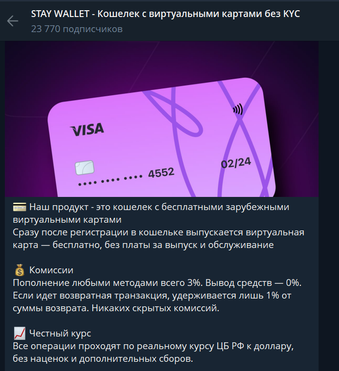 Несмотря на это, продолжает работать канал в Телеграмм с ником StayWalletTg, где видно, что кошелек поддерживал зарубежные карты и криптовалюту, хотя подробностей все равно нет и скриншотов личного кабинета тоже.