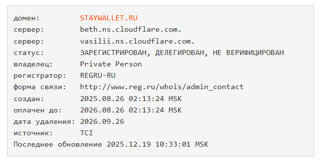 Проверка доменного имени StayWallet ru через сервис Whois показала, что его зарегистрировали только 06.08.2025, то есть, на две недели раньше создания канала в Телеграм.
