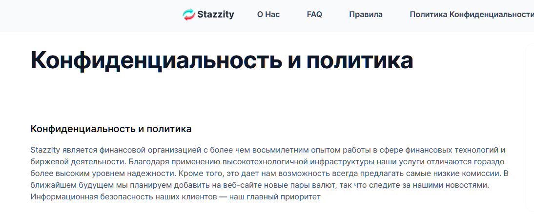 В пользовательском соглашении нет ни слова про компанию, которая несет ответственность за финансовые транзакции. Единственное, что сообщают про Stazzity обменник – сервис принадлежит финансовой компании с восьмилетним опытом работы на бирже.