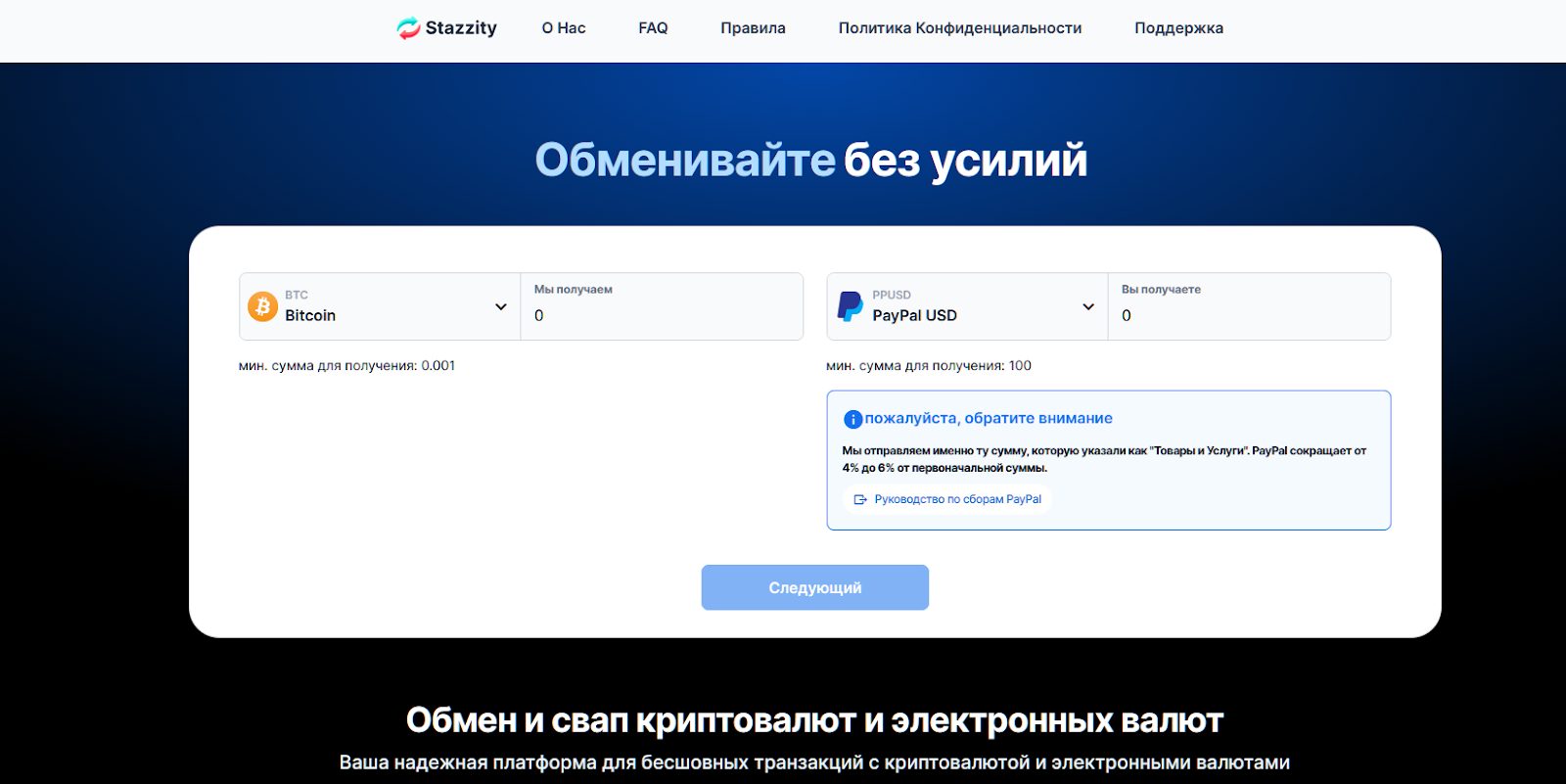 Обменник криптовалют на сайте stazzity com имеет лаконичный и простой дизайн. На сайте минимум информации про компанию и гарантии для пользователей. Сервис гарантирует безопасный и анонимный обмен крипты.