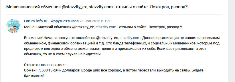- найдено много предупреждений, что Stazzity обменник – мошенничество;