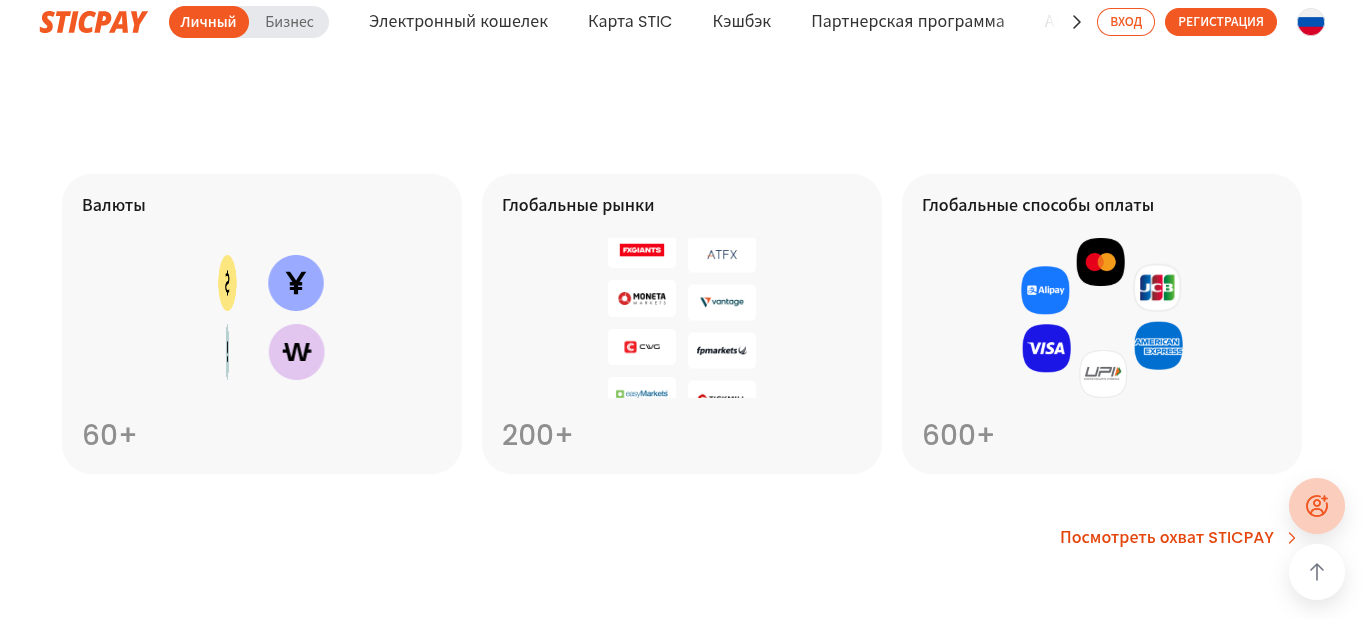 Перед блоком с преимуществами мы нашли небольшую статистику, которой хвастались разработчики. Они отмечали, что через экосистему проекту трейдеры могут покупать и продавать свыше 60 фиатных валют. Кроме того, с одного аккаунта у пользователей есть доступ к более 200 глобальных рынков, включая: фондовые индексы, драгоценные металлы, криптовалюты, энергоносители. Оплачивать все сделки через проект «Стикпэй» можно более 600 способами.
