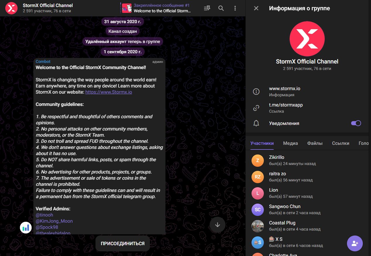 Потом Stormx демонстрировал только автоматические сообщения – о том, что кто-то присоединился к чату или был забанен на конкретное нарушение. На февраль 2026 года здесь остался 2 591 участник. Никакой целевой активности в чате не наблюдается.