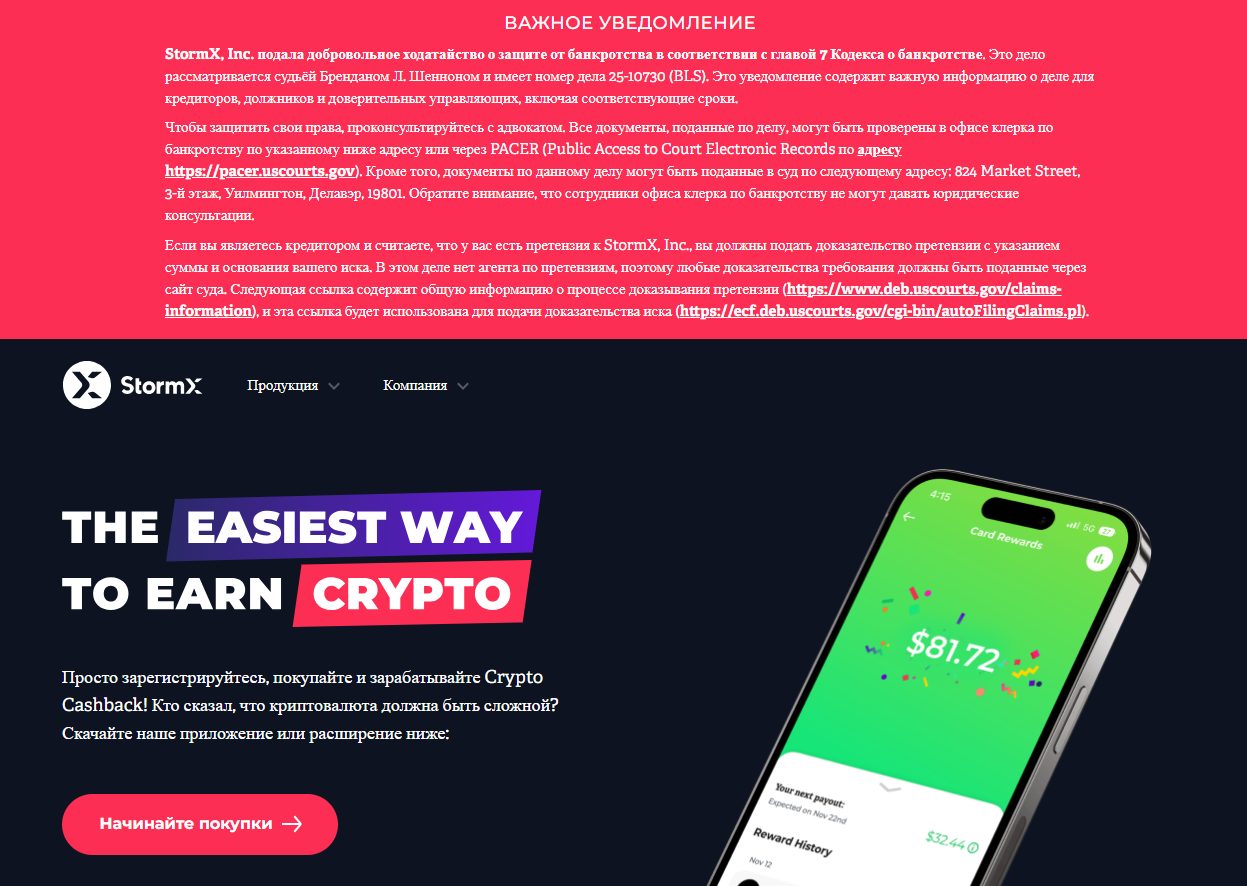 Согласно информации из открытых источников, в конце 2024-начале 2025 года компания Stormx анонсировала слияние с проектом EarnM, но партнерство так и не состоялось. После этого и было подано заявление о банкротстве.