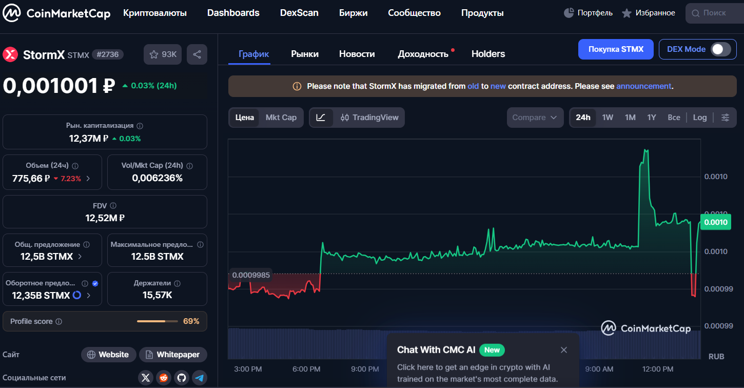 У Stormx также есть собственный токен $STMX – на сайте есть информация о заработке на стейкинге, но на февраль 2026 года стоимость актива низкая ₽0,001001. Ликвидность минимальна.