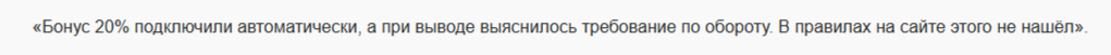 В следующем фидбеке обманутый клиент говорит, что бонус ему выдали сразу. Но при попытке снять средства сотрудники фирмы заявили, что выданные акционные деньги нужно «отбить». В правилах ничего об обороте сказано не было.