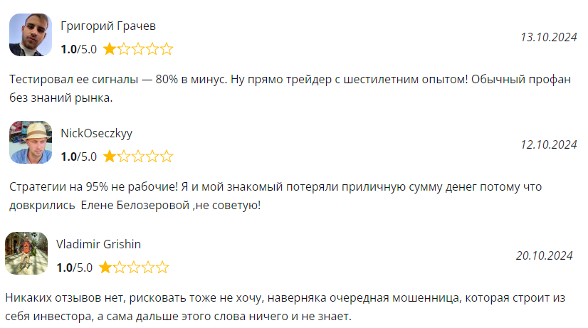 Люди жалуются на то, что в действительности курсы Елены на новичков и начинающих трейдеров как раз таки не рассчитаны. Материалы, продаваемые Белозеровой, могут оказаться доступными для понимания только гражданам, которые и так уже разобрались с тонкостями эффективного трейдинга. Это то, что касается изложения образовательной программы и предоставления ее публике. Но у Елены отсутствуют подтверждения наличия профильного образования.