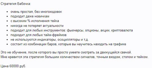 Владелец интернет-академии «Стратегия Бабочка» Елена Белозерова заявляет, что предлагаемая ей стратегия обладает высокой точностью, которая достигнута благодаря наличию многолетнего опыта автора курсов в трейдинге. Разработчик trading методики предоставляет пользователям торговые сигналы и платные услуги по сопровождению в сделках.