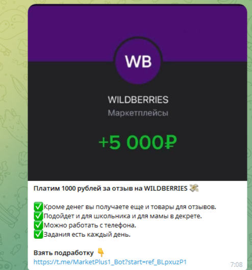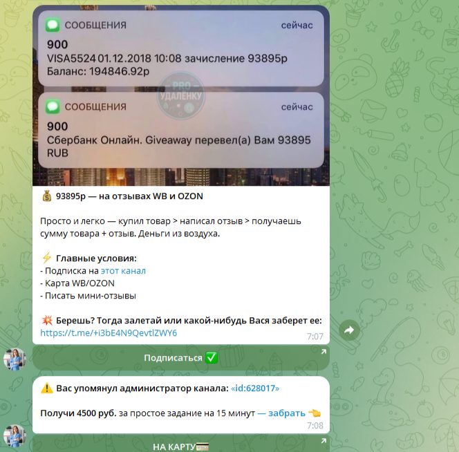 Самое крупное вознаграждение подписчикам канала «Светлана Кирова удаленная работа» якобы выплачивается за подработку на ресурсе «Подбор вакансий». Переход по ссылке и регистрация на данном канале обеспечивают доход в размере 93 895 рублей. На самом же деле пользователи не увидят упомянутых средств. За ширмой щедрости скрываются мошенники, которые разведут наивных простаков на покупку товара от 4 000 рублей и спокойно присвоят себе эти деньги.