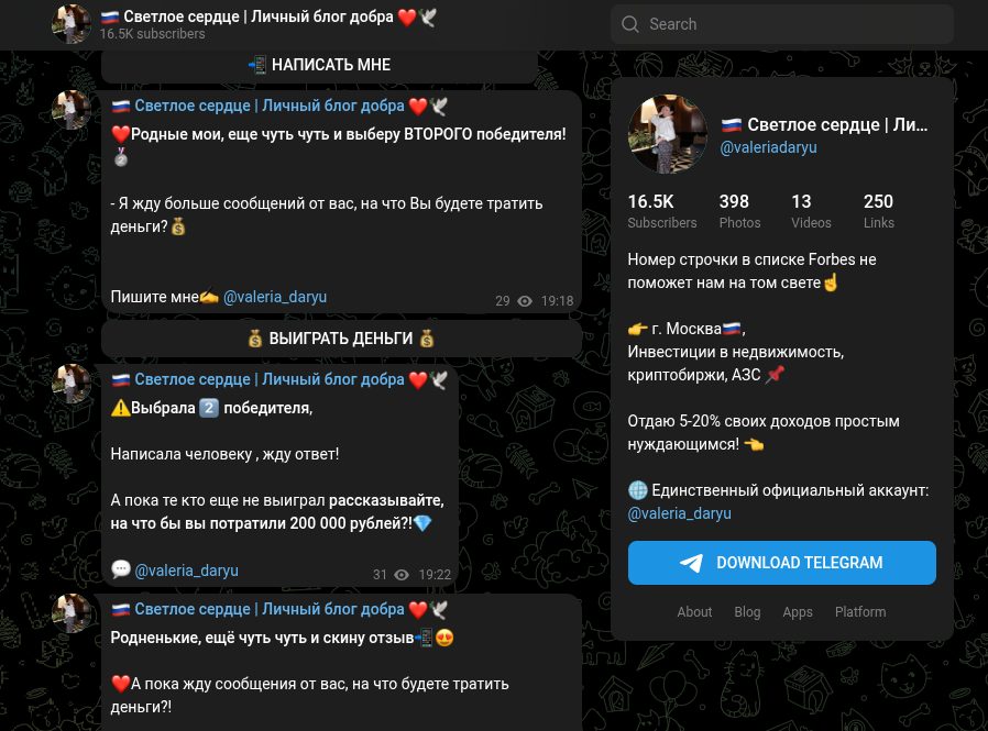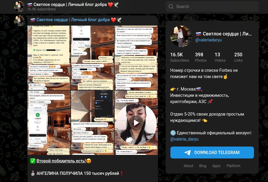 Канал «Светлое сердце Личный Блог» (@valer1ya dobro) – это проекта в Телеграм, где автор обещает раздачи денег, подарки подписчикам и поддержку «нуждающимся». По легенде, админ выступает как благотворитель, который стабильно отправляет по несколько тысяч рублей случайным людям. Такая подача выглядит привлекательно, хотя за ней просматривается привычный сценарий, где под видом добрых намерений работает чисто мошенническая тема.