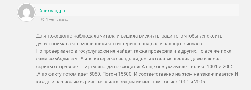 Основная проблема проекта – полная непрозрачность. Автор (якобы трейдер Валерия) ничего о себе не рассказывает, а только настойчиво создает образ «щедрого благотворителя» и опытного финансового специалиста. В ленте админ постоянно выкладывает посты с какими-то переводами, но это всего лишь неподтвержденные скриншоты. Мошенники обычно сами изготавливают такие доказательства в обычном редакторе.