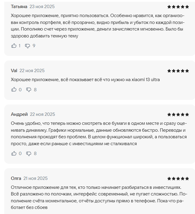 В целом у приложения «Свои Инвестиции» рейтинг хороший – 4,5 балла из 5. Пользователи довольно активно скачивают его и используют. Однако, есть и недовольные клиенты, которые рассказывают о недоработках, которые имеются в программе. Приложение обновляется и совершенствуется, разработчики устраняют возникающие ошибки и проблемы в работе. Так что в целом мнение о программе у пользователей положительное.