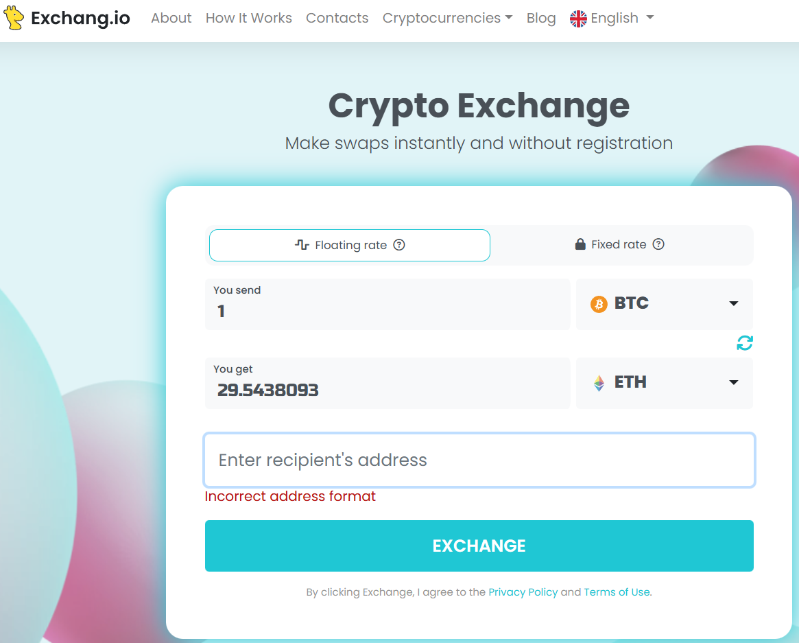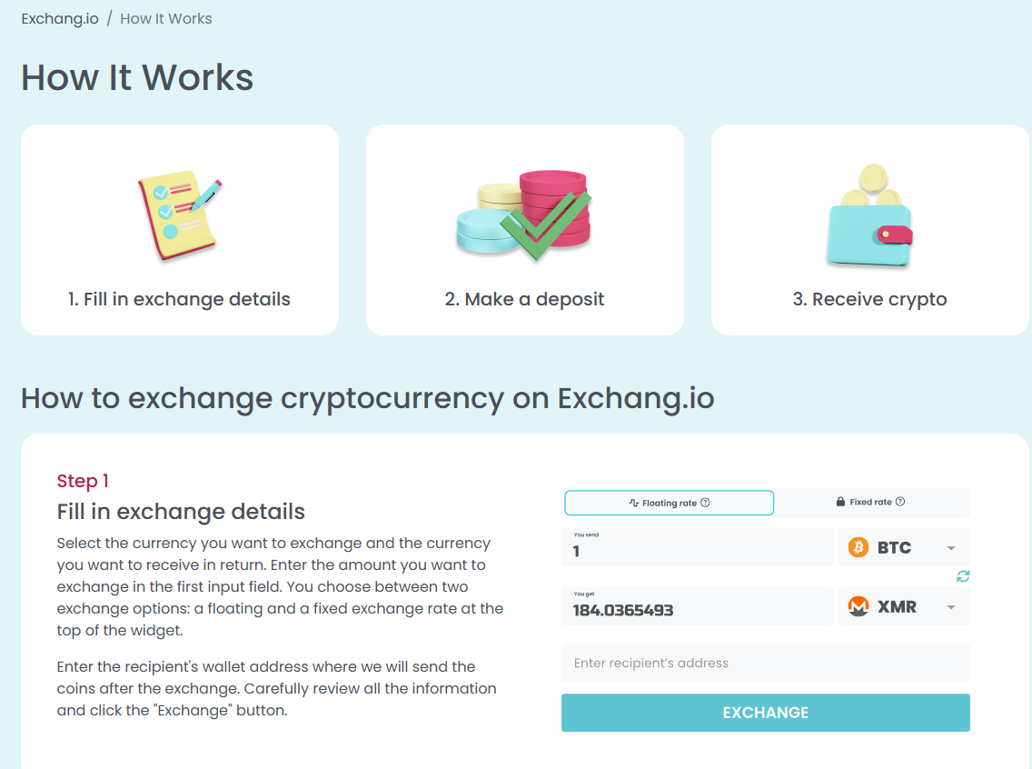 Процесс криптообмена интуитивно прост: пользователь выбирает пару, указывает адрес кошелька, вносит депозит и ждет совершения транзакции. Регистрация не обязательна и более того не предусмотрена. Минимальная сумма обмена варьируется в зависимости от монеты и может составлять $1.5-15. Заявленное время транзакции – 5-15 минут. Информации о комиссия не представлено.