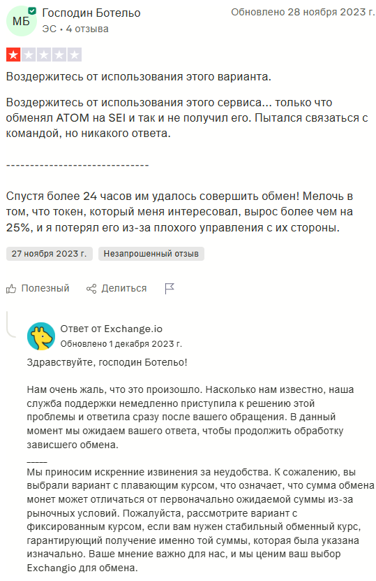 На Swapika присутствует и одна жалоба. Юзер посетовал на то, что обмен долго не проходил, поддержка не отвечала. Заявка была исполнена лишь спустя сутки, но пользователь потерял деньги, так как за это время один из токенов вырос на 25%. Сотрудники Exchang в ответе признали свою ошибку.