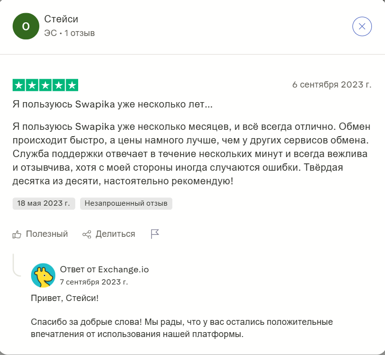 Создатели публикуют ссылку на профиль компании на известном сервисе TrustPilot. Рейтинг Swapika – 4.6 на основе 27 отзывов, что может свидетельствовать о добропорядочной репутации. В одном из откликов пользователь по достоинству оценил работу техподдержки, скорость выполнения транзакций, стабильную работу на протяжении нескольких месяцев. Подобных отзывов большинство.