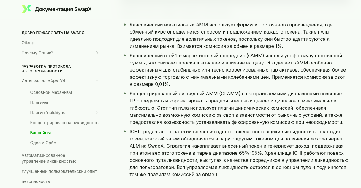 По своей сути SwapX — это обычная децентрализованная биржа (DEX). Однако технологический стек проекта довольно внушителен, нам предлагают гибкие условия для разных типов активов. В протокол входит сразу несколько вариантов пулов: