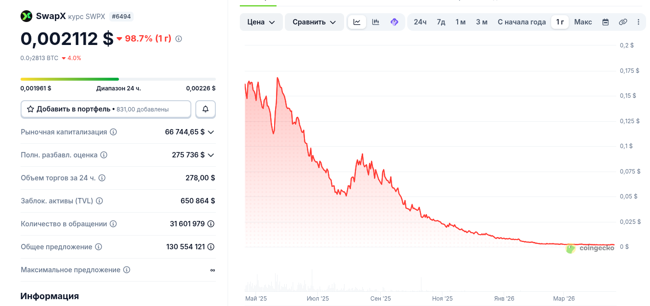 Рыночные показатели актива оптимизма не внушают. На момент написания обзора в середине апреля 2026 года стоимость SWPX балансирует около отметки $0,00199. Общая рыночная капитализация едва дотягивает до 63 тысяч долларов, а суточный торговый объем нередко опускается ниже $100. По сути, токен SWPX — абсолютно неликвидный инструмент.