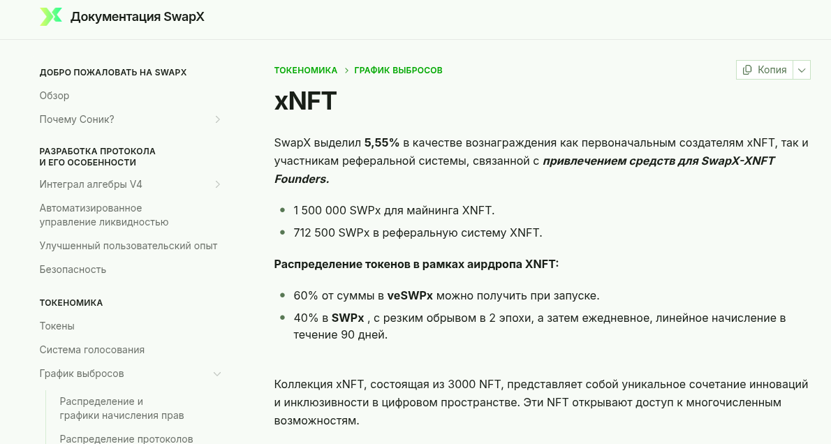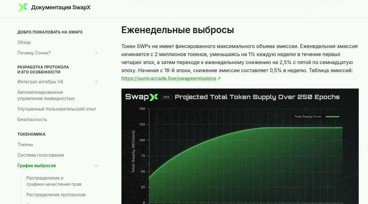 Главный двигатель внутренней экономики — токен SWPX, развернутый в блокчейн-сети Sonic. У актива нет жесткого лимита на максимальное предложение — создатели выбрали модель с бесконечной эмиссией. На старте в оборот выпустили 40 млн единиц, а затем включился алгоритм еженедельной чеканки. Она началась с 2 млн токенов и со временем будет плавно снижаться.