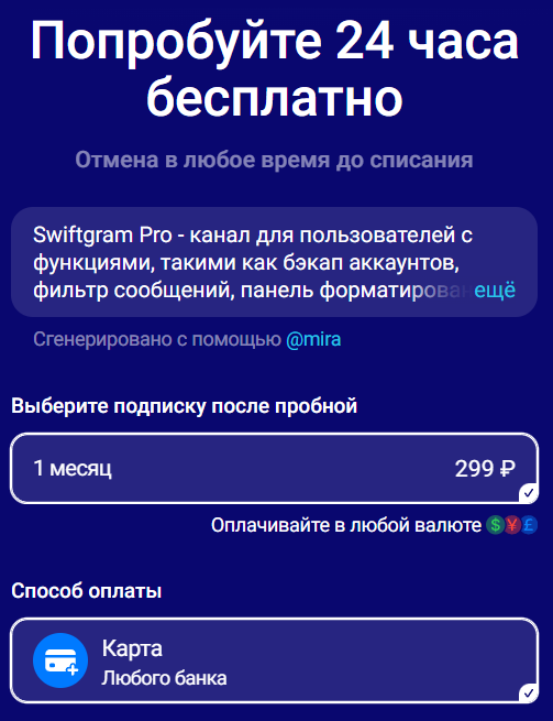 Цена составляет ₽300 в месяц, но можно протестировать все функции без оплаты на протяжении 24 часов.