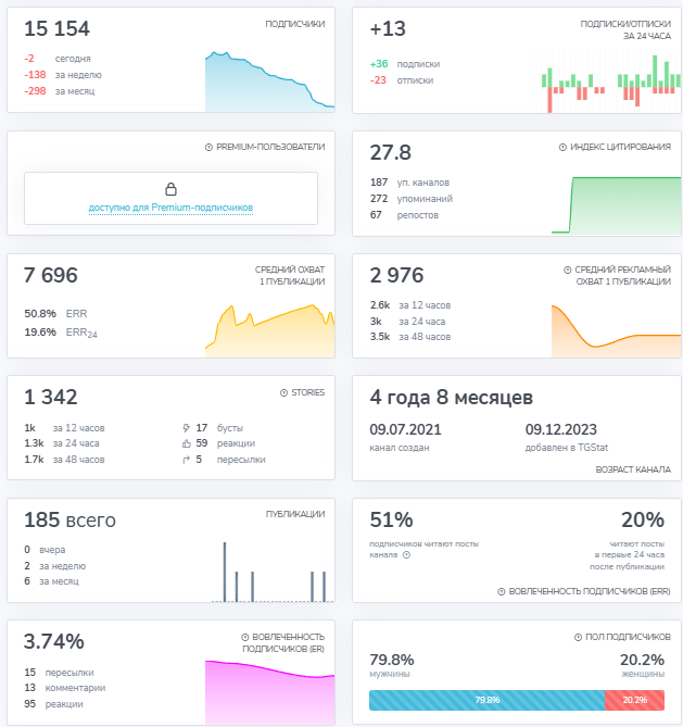 Ботом SwiftGram bot пользуются более 700 000 человек в месяц, что говорит о высокой популярности, но на канале в Телеграмм подписчиков гораздо меньше – 15 000. Несмотря на это, статистика с TgStat дает понять, что показатели настоящие, потому что 50% пользователей просматривают посты, а вовлеченность доходит до 4%.