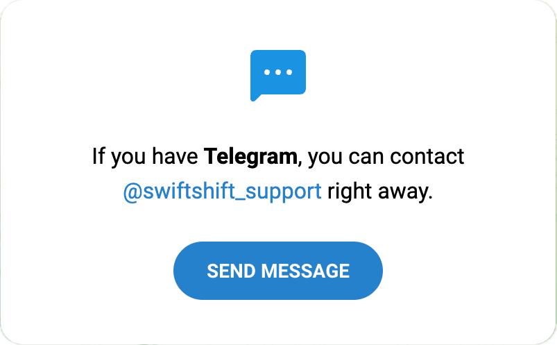 Основным каналом связи заявлен Телеграм аккаунт Swiftshift support. Такой формат удобен для оперативных ответов, однако перенос коммуникации в мессенджер снижает прозрачность сопровождения сделки. История переписки становится единственным подтверждением договоренностей.