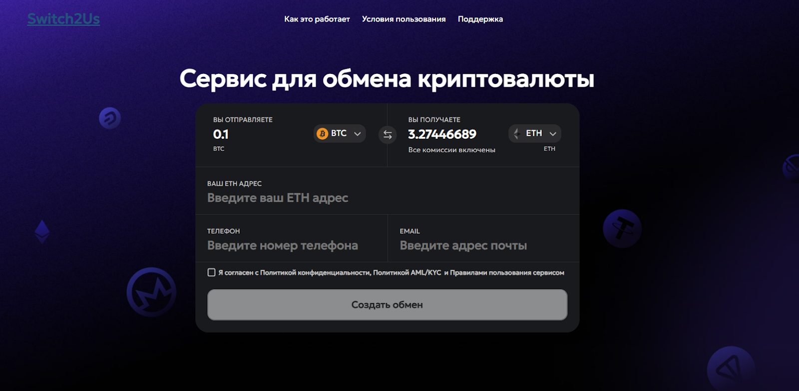 Switch2us заявляет, что ориентирована на работу с токенами самых разных сетей. Своей главной целью сервис ставит обеспечение быстрого и удобного обмена крипты. Платформа поддерживает работу с централизованными и децентрализованными биржами, благодаря чему обмен между ними совершается максимально быстро. Своими преимуществами обменник называет: