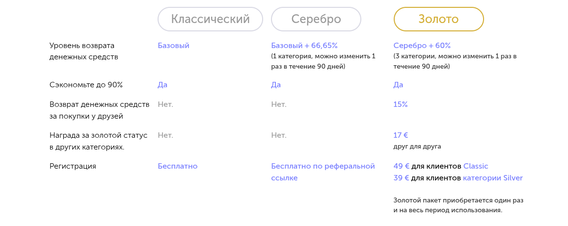 Легенда платформы строится на возврате средств за покупки. Однако, чтобы получать хоть сколько-нибудь заметный кэшбэк, пользователя вынуждают платить. Базовый уровень Silver приносит копейки, пирамида «Свитипс» начинает работать лишь после покупки статуса Gold за 39–49 евро.