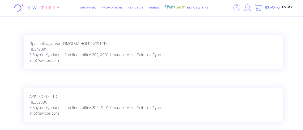 Начнем анализ проекта с главного — юридической базы. В футере сайта SWITIPS пишут, что платформой управляет компания APIN FORTE LTD по лицензии FIMOLVIA HOLDINGS LTD. Обе конторы зарегистрированы на Кипре, а это стандартный ход для желающих спрятать концы в воду. Офшорная прописка позволяет уходить от ответственности перед вкладчиками из СНГ. Если ваши деньги «зависнут», судиться придется в Лимассоле, что для рядового пользователя просто нерентабельно.