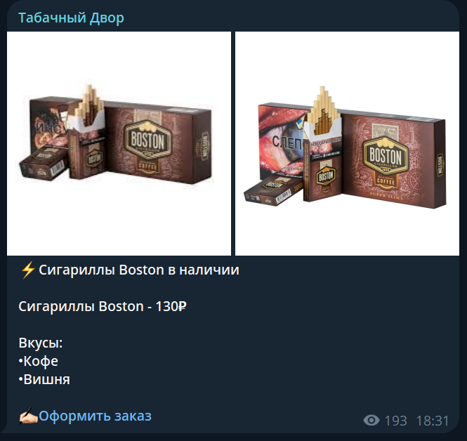 Телеграм-канал «Табачный двор» является единственной торговой точкой данной компании. У нее отсутствует официальный сайт или физический магазин. У многих людей это уже вызывает подозрение в надежности. В данном ТГК нет контактных данных, так как вся связь осуществляется исключительно через социальную сеть Телеграм. Позвонить как-либо иным способом и уточнить детали тут нельзя. Под некоторыми постами указывается контакт для заказа и с ним уже ведется общение.
