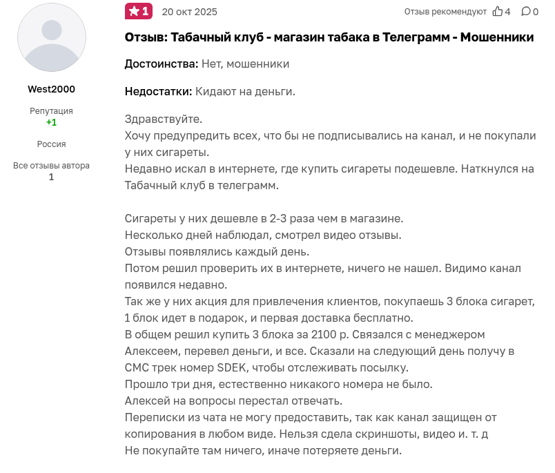 У проекта Табачный Клуб в Телеграмме отзывы негативные — люди пишут, что здесь их обманывают на деньги. Подобные проекты вообще запрещены политикой мессенджера и не так давно ТГ провел масштабную чистку каналов, где продавалась табачная продукция. Но они начали появляться вновь.