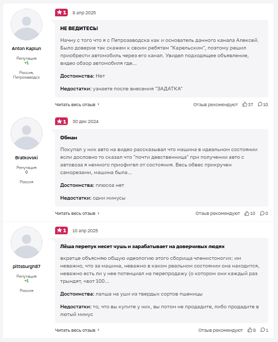 Очевидно, что качество предоставляемых услуг оставляет желать лучшего, а сами владельцы канала «Тачки от Лекс авто» в телеге явно накручивают положительные отклики. Вот только пользователей, столкнувшихся с обманом, очень много, и сейчас они уже готовы подать коллективную жалобу в прокуратуру.