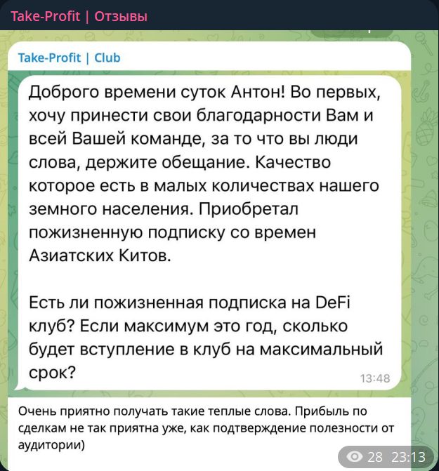 О трейдере с телеграм-канала Take profit club отзывы встречаются разные. Если рассматривать внешние площадки, то там преимущественно негативное впечатление о работе с трейдером. При переводе денег менеджерам начинались блокировка со стороны банков. Администрация плохо общается с клиентами. В отдельном канале с отзывами Tpc_reviews представлены только хорошие комментарии о работе с трейдером. Люди покупают несколько годовых подписок сразу, получают крупные профиты и существенно повышают свой заработок. Но комментариям на таких внутренних площадках не стоит доверять.