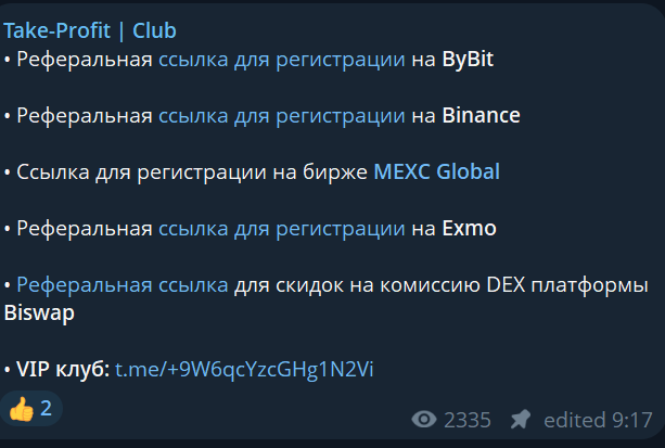 Для работы с трейдером в закрытом клубе требуется зарегистрироваться на одной из предложенных бирж по его реферальной ссылке. Здесь представлены стандартные биржи. Стоит отметить, что реклама закрытых площадок на Take profit club появляется не часто. Большая часть контента остается новостной, что несколько выделяет канал на фоне аналогичных скам платформ.