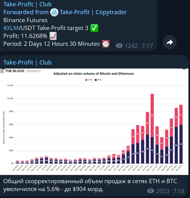 Канал в Телеграме Take profit club посвящен трейдингу и работает уже более пяти лет, что для многих внушает доверие. Автор канала регулярно публикует новости, которые касаются рынка криптовалют, международной торговли и прочих подобных событий. Тут рассматриваются как крупные, так и мелкие события, которые могут повлиять на стоимость активов или являются следствием скачков стоимости определенных токенов, акций или иных торговых инструментов. Часто это просто статистические данные или уведомление об изменении тренда, где нет глубокой аналитики.