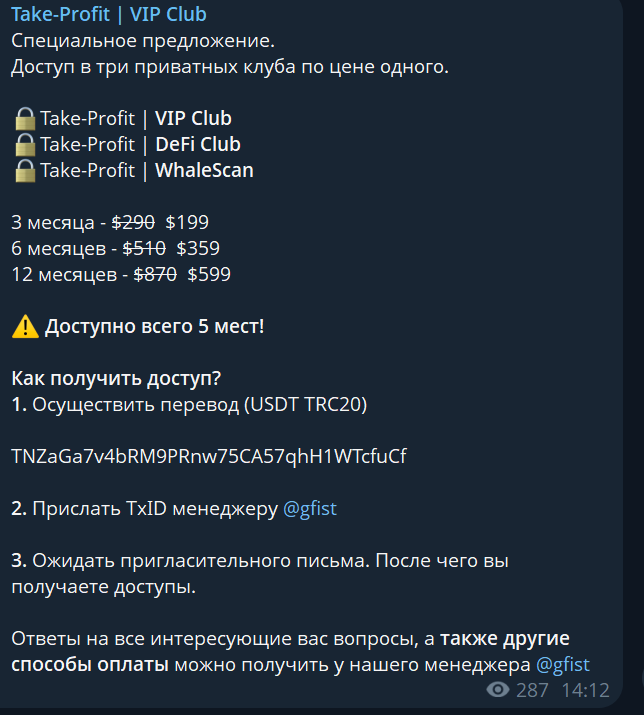 К основным услугам, которые предлагает трейдер на своем канале, является подписка на закрытый клуб. Традиционно для подобных предложений подписчикам предлагается скидка на вступление в три клуба по цене одного, а также ограниченное количество мест. Но это предложение дублируется практически не меняясь каждый раз при появлении рекламы. Оплата осуществляется через менеджера. Расценки на подписку сразу на VIP club, DeFi club и Whalescan выглядят так: