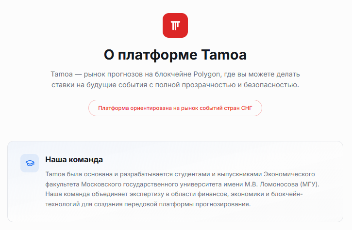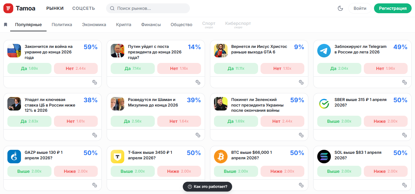 Tamoa pro – онлайн-ресурс, который анонимные руководители презентуют как рынок прогнозов на блокчейне Polygon. Зарегистрированные пользователи пополняют кошелек USDT или другой криптой, выбирают рынок и представленные события, а затем покупают акции, нажав “да” или “нет”. Платформа предсказаний ориентирована на события в РФ и СНГ. Раскроем больше подробностей в нашей статье.