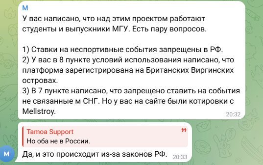 - техподдержка работает только через аккаунт в Telegram. По представленой на сайте ссылке @ tamoa market находится паблик проекта (46 участников) с открытыми комментариями. Саппорт обещает отвечать в течение нескольких часов, в рабочие дни – быстрее.