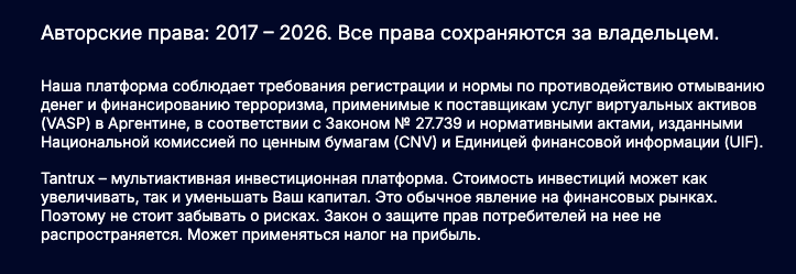 В футере сайта брокера заявлено, что его деятельность регулирует аргентинское финансовое агентство. Убедиться в этом нет возможности, так как конкретный номер лицензии, которая выдана управляющей биржей организации, не представлен.