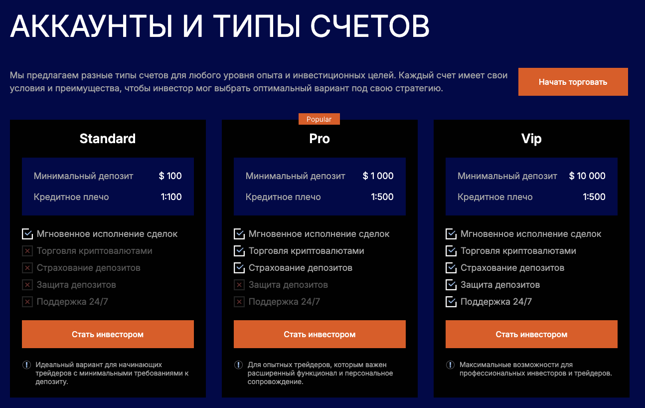 Кредитное плечо на рассматриваемой бирже — от 1 к 100 до 1 к 500. О спредах и комиссиях никакой информации в рекламных материалах брокера нет.