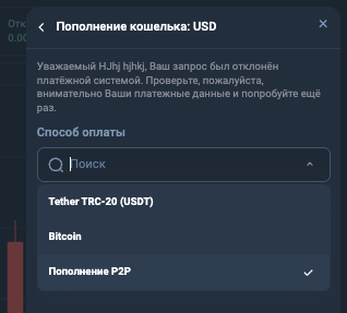 Среди платежных методов присутствуют криптовалютные кошельки USDT и Bitcoin. Также заявлена поддержка P2P, но на момент написания этого обзора данный способ внесения средств не работал.