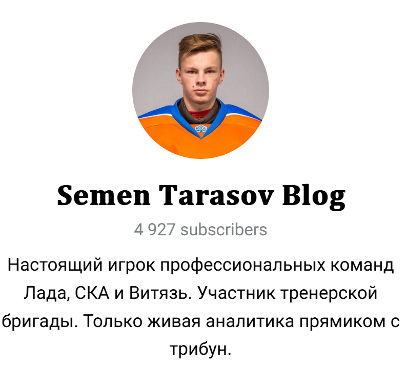 Автор канала Хоккейный Блог в Telegram — Тарасов Семен. Парень не скрывает ФИО и даже приводит краткую биографию. Он не скрывает лицо и регулярно хвалится своими достижениями.
