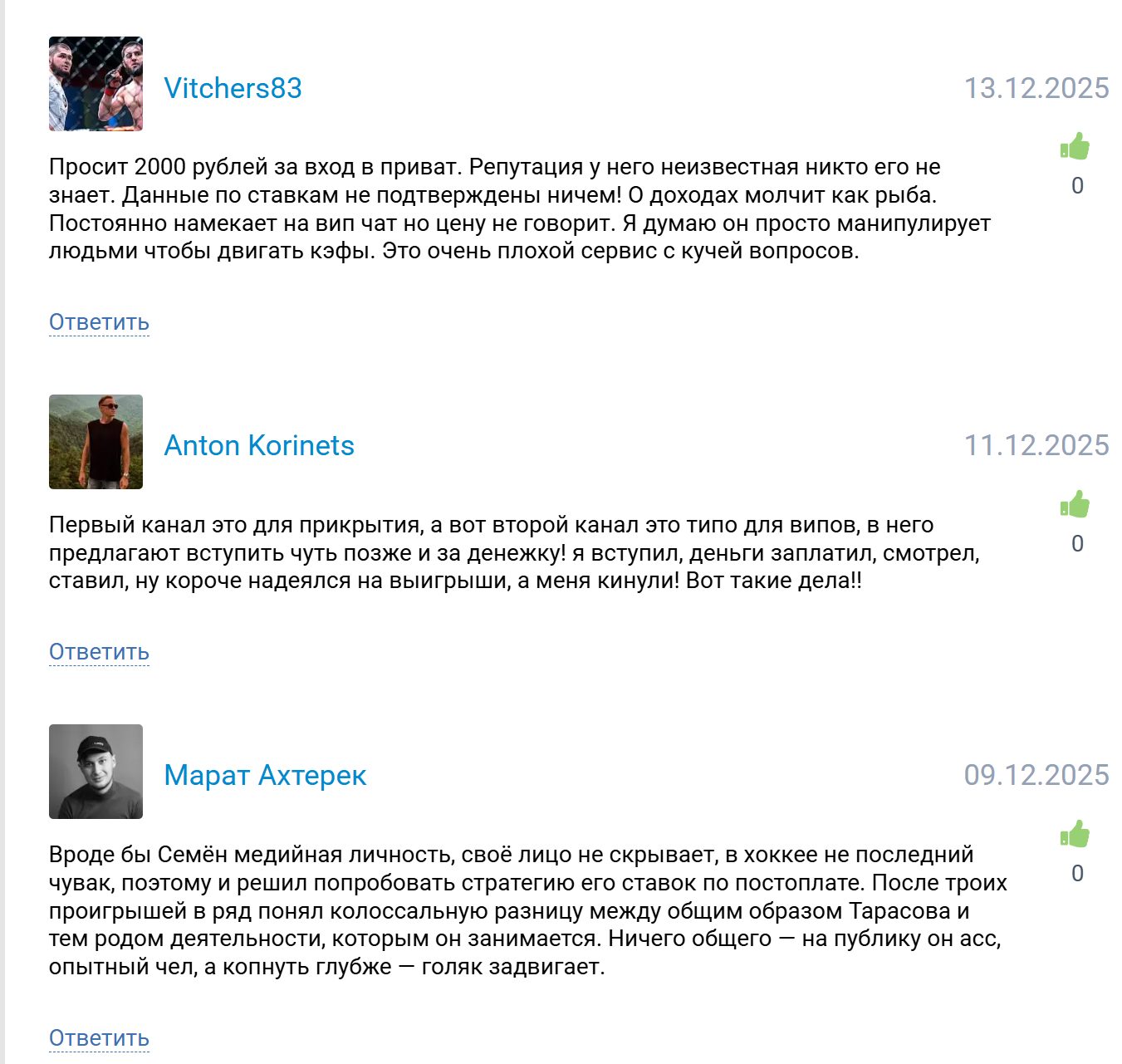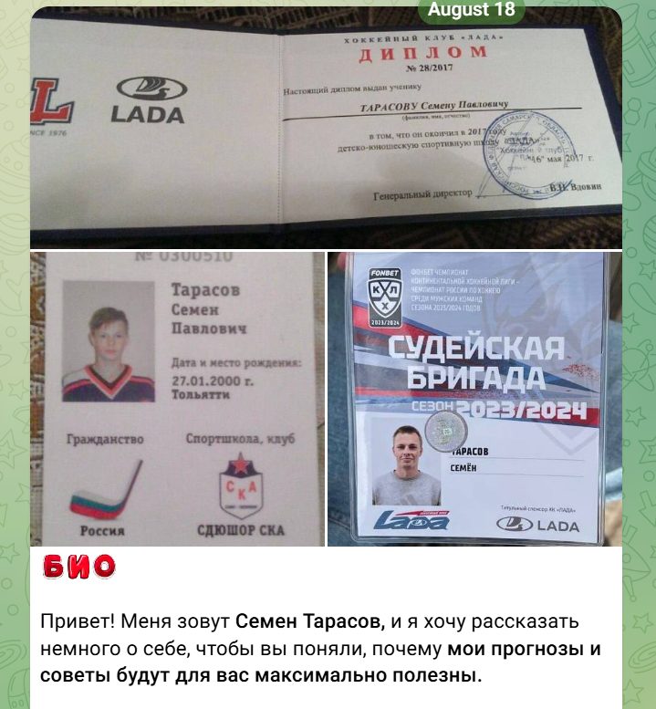Семен Тарасов позиционирует себя как публичную личность и профессионального спортивного аналитика. Он привлекает возможностью заработка на хоккее и активно продвигает ВИП-канал, но по факту его клиенты теряют деньги.
