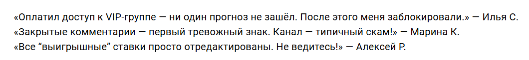 • Завлечение к покупке доступа в ВИП-канал, где, по заявлению автора, доступно больше точных сигналов.