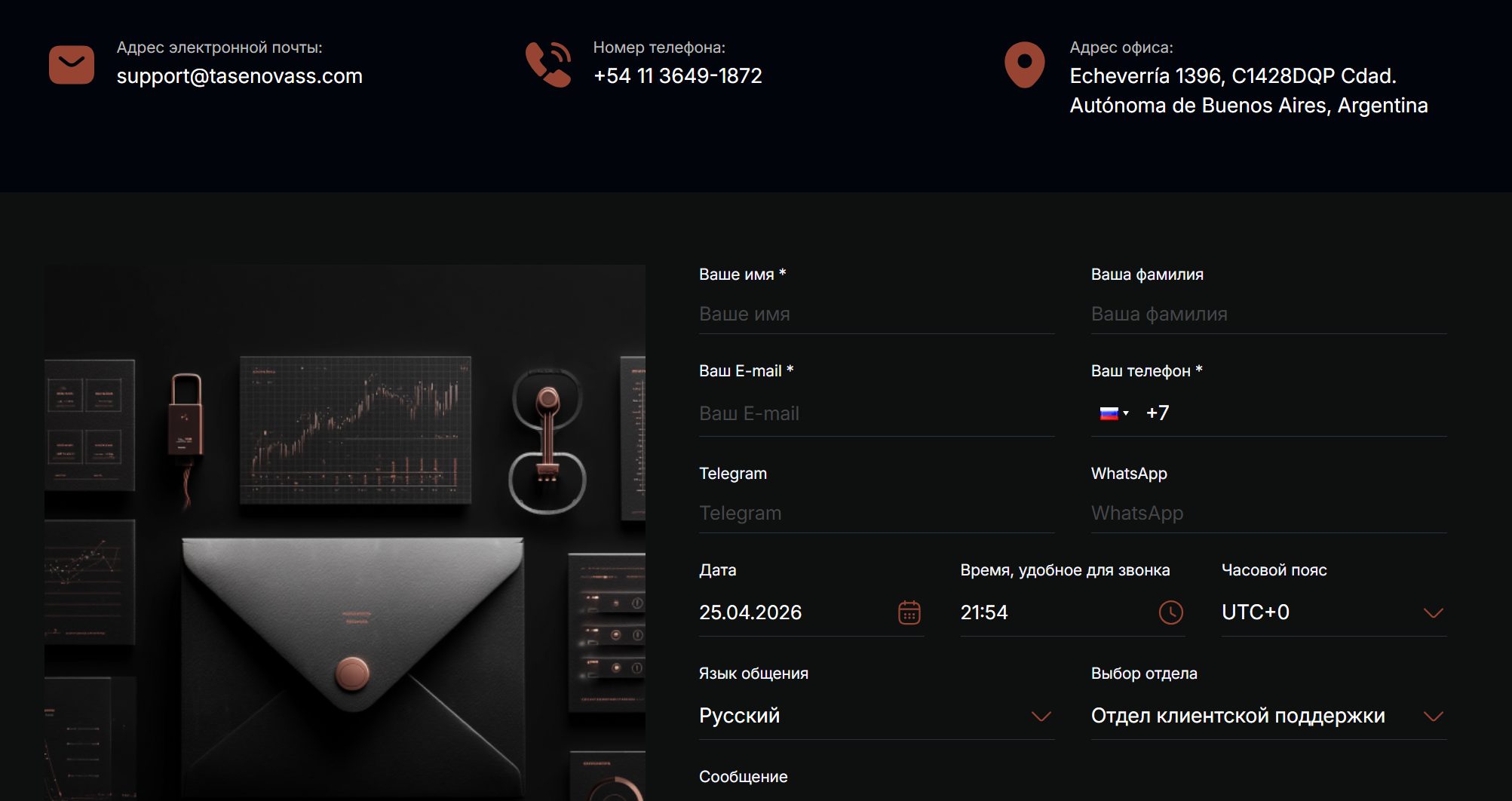 Основным электронным адресом для обращений в службу поддержки является support tasenovass com. Также клиентам предлагается телефонный номер на сайте. Доступна форма обратной связи, через которую можно отправлять сообщения из личного кабинета.
