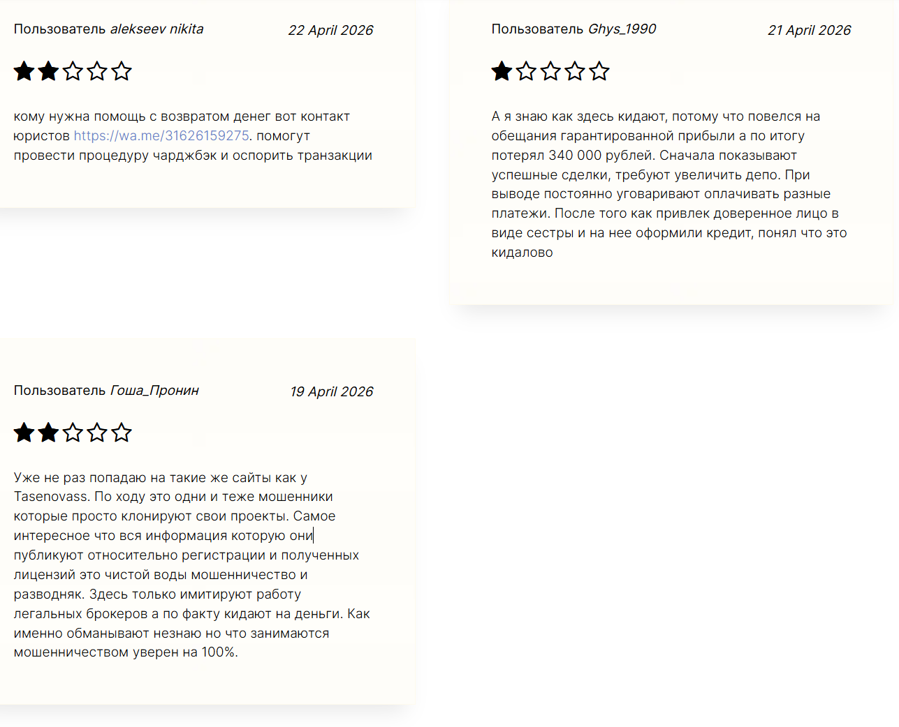 Один из участников описал ситуацию, когда после депозита в $500 его баланс вырос до $3000. При запросе на вывод сотрудники потребовали оплатить налог, затем дополнительную комиссию. После этого личный кабинет заблокировали. Представители Tasenovass сами могут выйти на связь. Сотрудники убеждают внести средства, а потом начинают навязывать дополнительные платежи под разными предлогами.