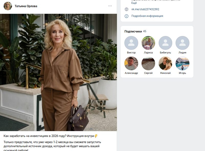По состоянию на середину апреля 2026 во «ВКонтакте» есть паблик, который называется «Татьяна Орлова», именно там основательница и предлагает заработок. В паблике есть приветственный пост, в котором указано, что Орлова работает на финансовых рынках свыше 6 лет, обучила заработку на крипте более 1 0000 женщин. Также утверждается, что у инвестора есть высшее экономическое образование.