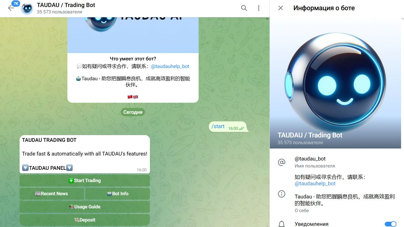 Taudau bot — это Телеграмм-бот, предлагающий услуги криптовалютной биржи. Клиентам обещают автоматизированную торговлю, отсутствие скрытых комиссий, а также быстрое исполнение сделок. Основатели уверяют в удобном интерфейсе и честной работе, и далее мы расскажем о деятельности бота в деталях.