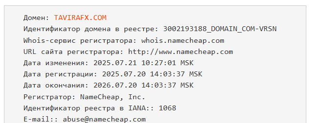 Владельцы пишут про 120 000 довольных клиентов, спреды от 0 пипсов и более 400 торговых активов, хотя с какого периода работает проект, непонятно. В одном месте указан 2005 год, в другом написано про 9 лет работы, а проверка домена через сервис Whois ru вообще показала, что имя TaviraFx com зарегистрировали только 20.07.2025.